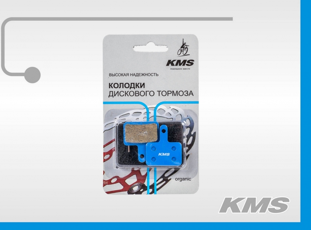 Колодки для дискового тормоза, материал органика, цвет голубой, логотип "KMS" на продукте, инд. упак. (блистер), русский дизайн, бренд "KMS" (вид №3) (Deore M515, M516,M515-LA,M525,M515-LA-M, M415, M465, M475, M485, M495, M395, CX75, C501, C601 Tektro Aurgia, Auriga Comp, Aquila)
