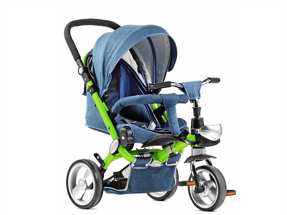 Велосипед трехколесный с управлением и летняя прогулочная коляска 2 в 1. Оснащен выдвижным глубоким козырьком, защищающим от солнца, регулируемой по высоте, удобной складной ручкой.